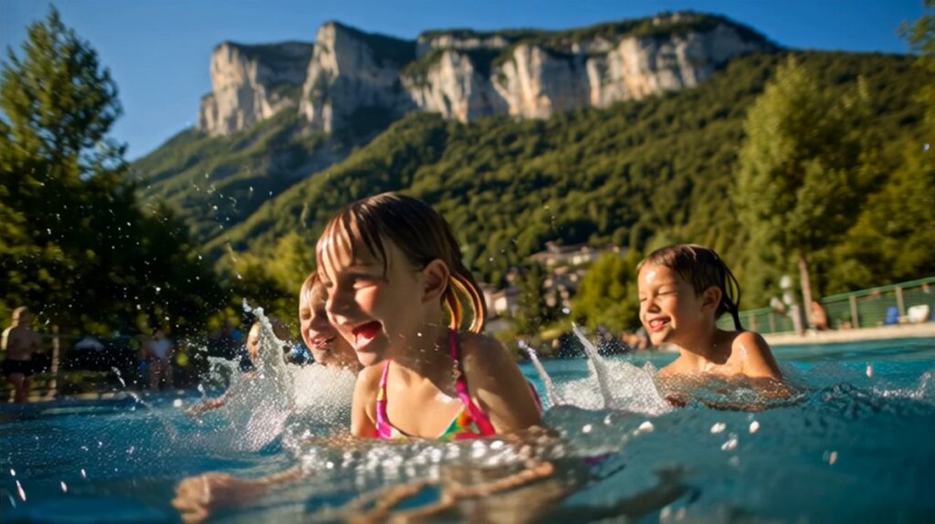 What makes our pool unique in France is its breathtaking panorama. Imagine floating in crystal-clear water while gazing at the Dent d’Arclusaz, the iconic peak that watches over the campsite. Between the blue of the water, the green of the peaks, and the azure of the Savoyard sky, you can enjoy an immersive swimming experience where the mountains invite you in with every stroke.